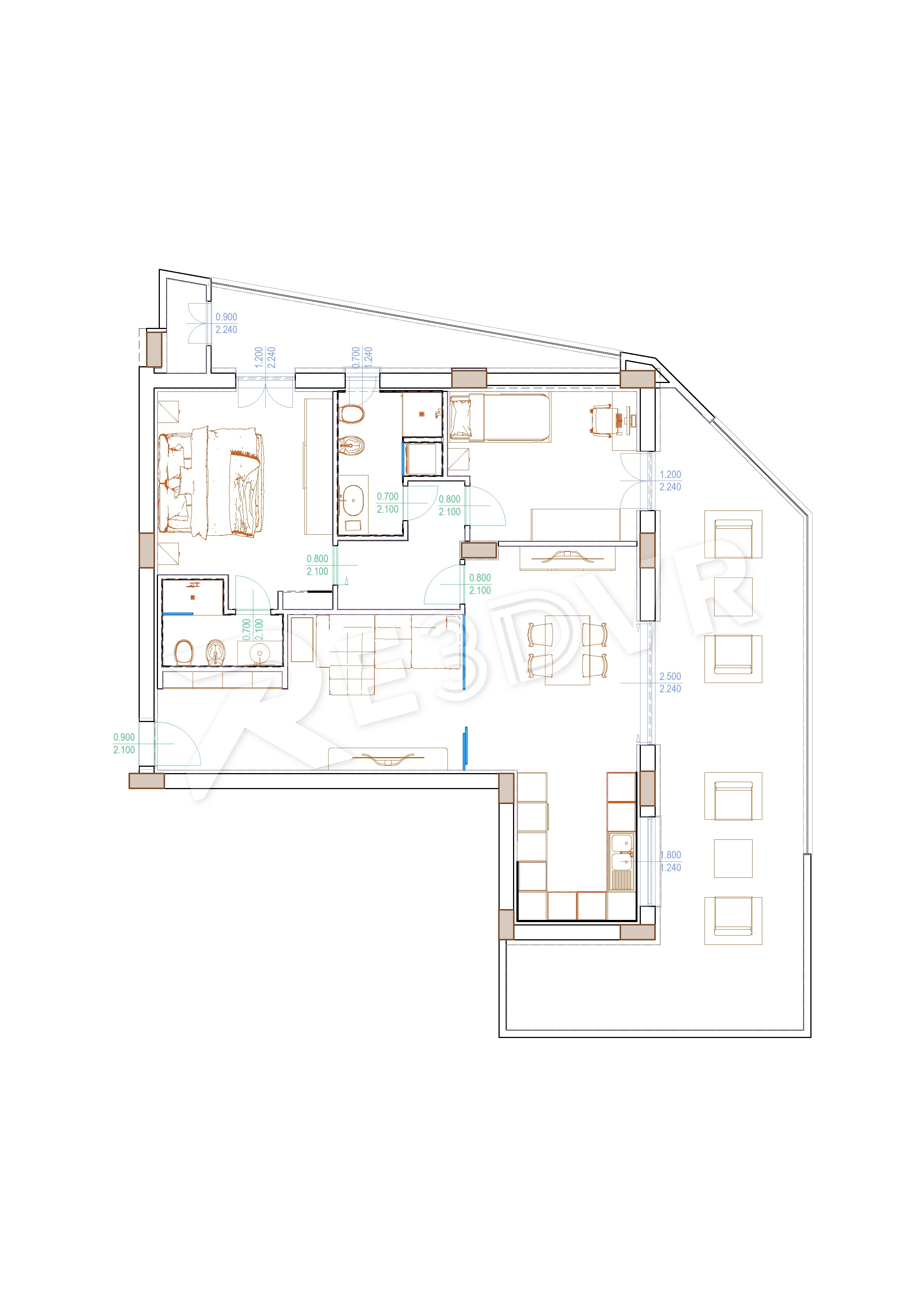 La distribuzione interna dell’abitazione è concepita secondo criteri di razionalità funzionale, orientati all’ottimizzazione delle superfici e alla corretta illuminazione naturale degli ambienti. La zona giorno è configurata come un ambiente open space destinato ad accogliere cucina e soggiorno, con la possibilità di inserire una vetrata interna quale elemento di separazione tra i due ambienti. Un disimpegno introduce alla zona notte, composta da una camera da letto singola, un bagno per ospiti e una camera matrimoniale dotata di bagno.
